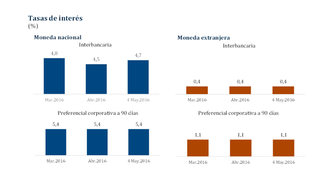 Al 4 de mayo, la tasa de interés interbancaria promedio mensual en soles fue 4,7 por ciento y esta tasa en dólares se ubicó en 0,4 por ciento anual. Para el mismo periodo, la tasa de interés preferencial corporativa -la que se cobra a las empresas de menor riesgo- en moneda nacional se situó en 5,4 por ciento, mientras que la de dólares fue 1,1 por ciento.