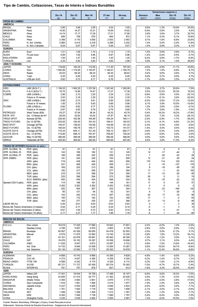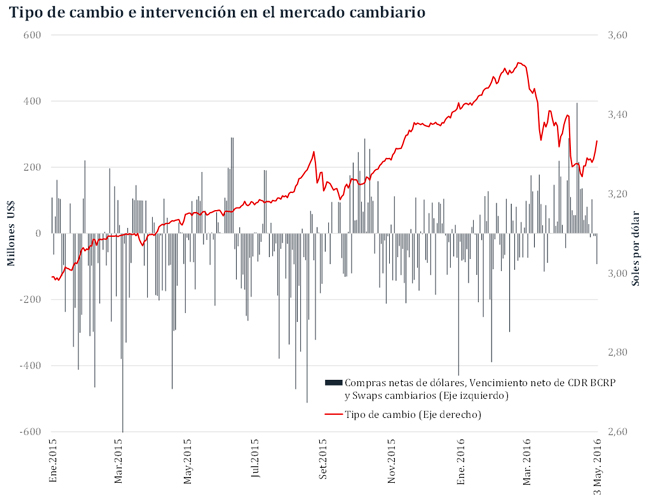 El 4 de mayo, el tipo de cambio venta interbancario cerró en S/ 3,33 por dólar, acumulando en lo que va de mayo una variación positiva de 1,4 por ciento y en lo que va del año una disminución de 2,4 por ciento.