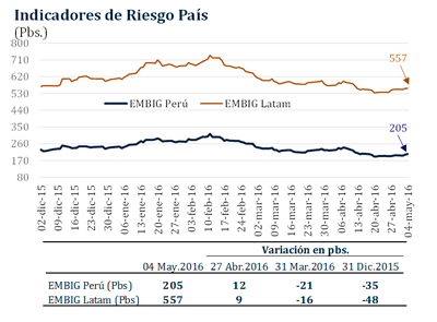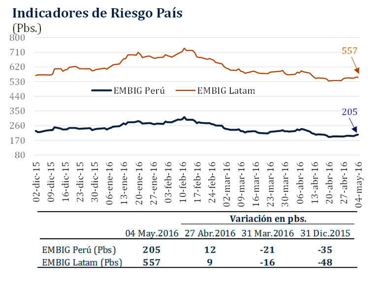 Del 27 de abril al 4 de mayo, el riesgo país medido por el spread EMBIG Perú pasó de 193 a 205 pbs.