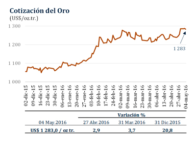 En el mismo período, el precio del oro subió 2,9 por ciento a US$/oz.tr. 1 283,0.