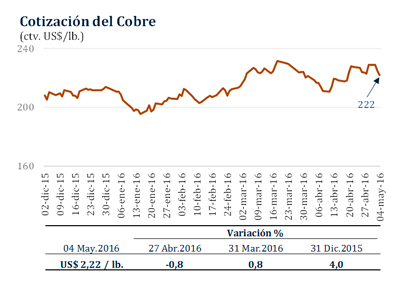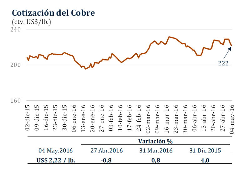 Del 27 de abril al 4 de mayo, el precio del cobre cayó 0,8 por ciento a US$/lb. 2,22.