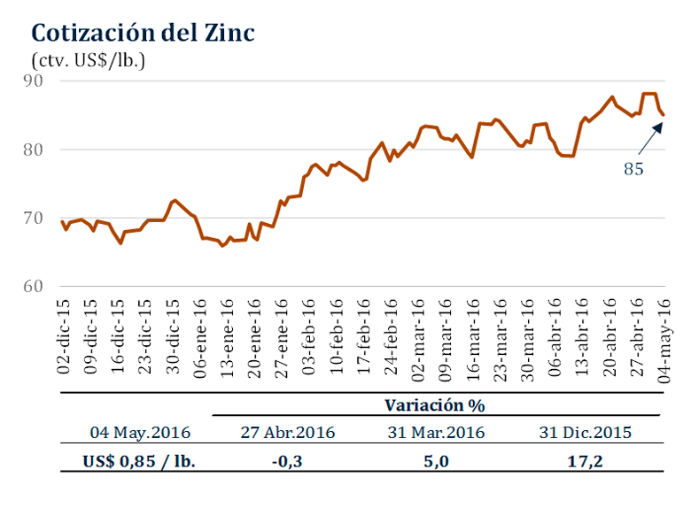 En similar periodo, el precio del zinc bajó 0,3 por ciento a US$/lb. 0,85.
