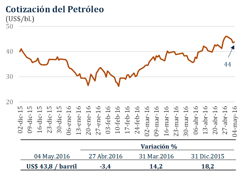 El precio del petróleo WTI bajó 3,4 por ciento entre el 27 de abril y el 4 de mayo, alcanzando US$/bl. 43,8.