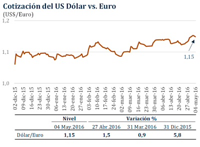 Del 27 de abril al 4 de mayo, el dólar se depreció 1,5 por ciento con relación al euro, en medio de una desaceleración mayor a la esperada del PBI de Estados Unidos en el primer trimestre y de la decisión de la FED de mantener su tasa de interés.
