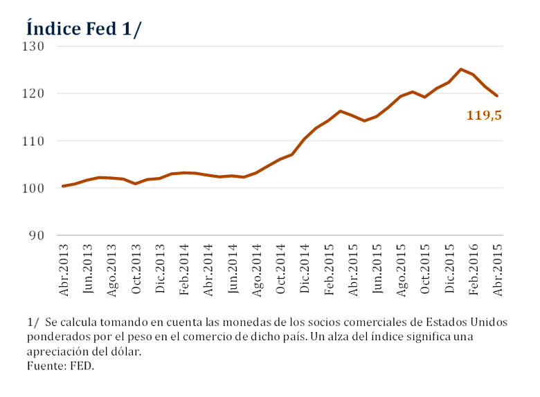La divisa norteamericana se ha apreciado en relación a las monedas del resto de países tal como se observa en la evolución del Índice FED desde enero de 2013. Esto debido a la expectativa del proceso de normalización de las tasas de interés de la Reserva Federal.