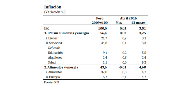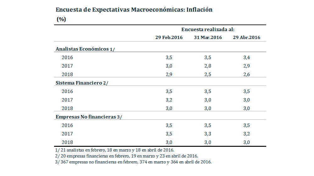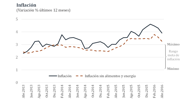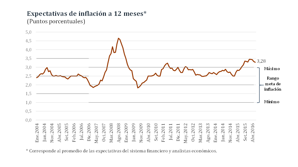 Las expectativas de inflación en abril se ubicaron en un rango entre 3,4 y 3,5 por ciento para el año 2016. En tanto, la inflación esperada a 2017 se encuentra en un rango entre 2,9 y 3,2 por ciento.