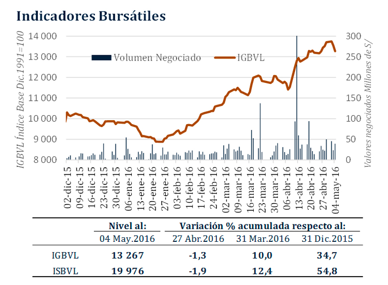 Del 27 de abril al 4 de mayo, el índice General de la Bolsa de Valores de Lima (BVL) bajó 1,3 por ciento y el Selectivo lo hizo en 1,9 por ciento.