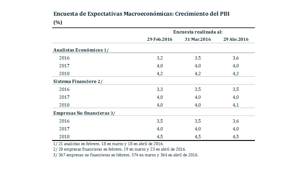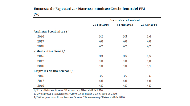 Las expectativas de crecimiento económico para el año 2016 se elevaron a 3,6 por ciento para analistas económicos y empresas no financieras. Para 2017, todos los grupos encuestados mantuvieron sus expectativas en 4,0 por ciento.
