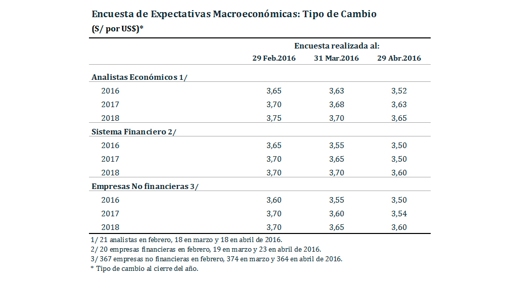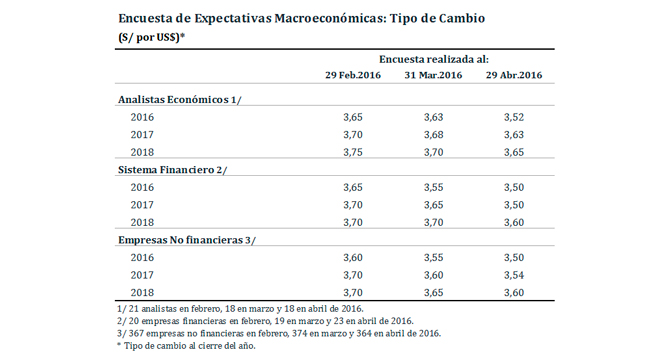 El tipo de cambio esperado para el cierre del año 2016 disminuyó a un rango entre S/ 3,50 y S/ 3,52 por dólar. Respecto de la encuesta de marzo, los tres grupos consultados redujeron sus expectativas de depreciación.