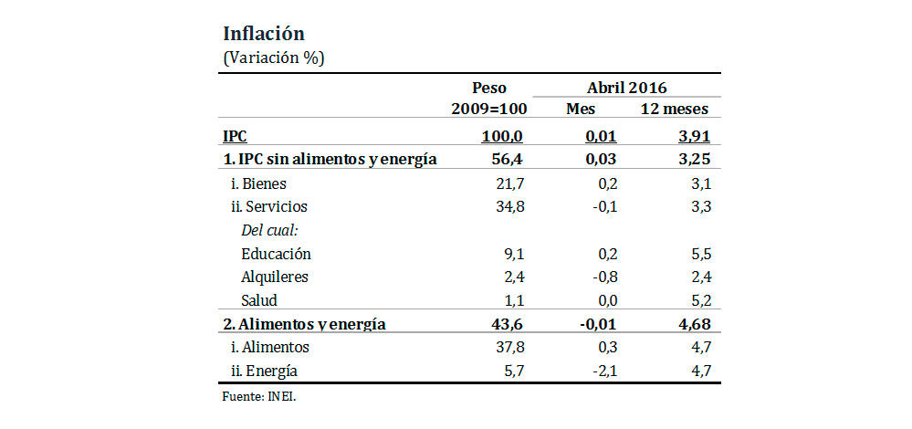 La variación del índice de precios al consumidor de Lima Metropolitana en abril fue 0,01 por ciento, con lo cual la variación de los últimos doce meses se redujo a 3,91 por ciento. La inflación sin alimentos y energía fue 0,03 por ciento en el mes y 3,25 por ciento en los últimos doce meses.
