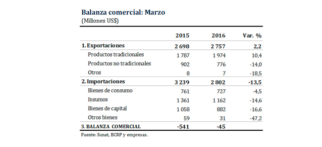 En marzo de 2016, las exportaciones llegaron a US$ 2 757 millones, de las cuales US$ 1 974 millones fueron de productos tradicionales y US$ 776 millones de productos no tradicionales.