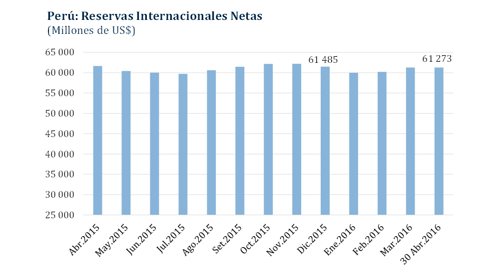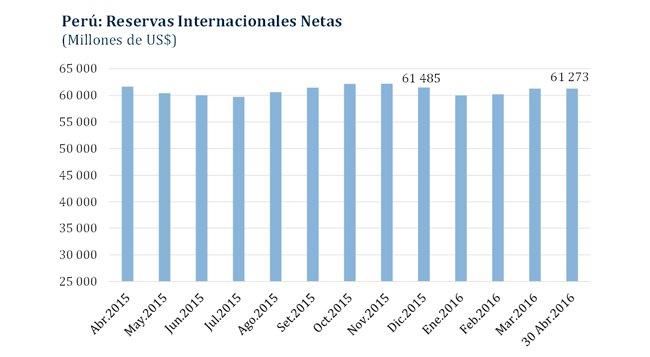 Al 30 de abril, las Reservas Internacionales Netas (RIN) totalizaron US$ 61 273 millones, constituidas principalmente por activos internacionales líquidos. Este nivel es equivalente a 32 por ciento del PBI y a 20 meses de importaciones.