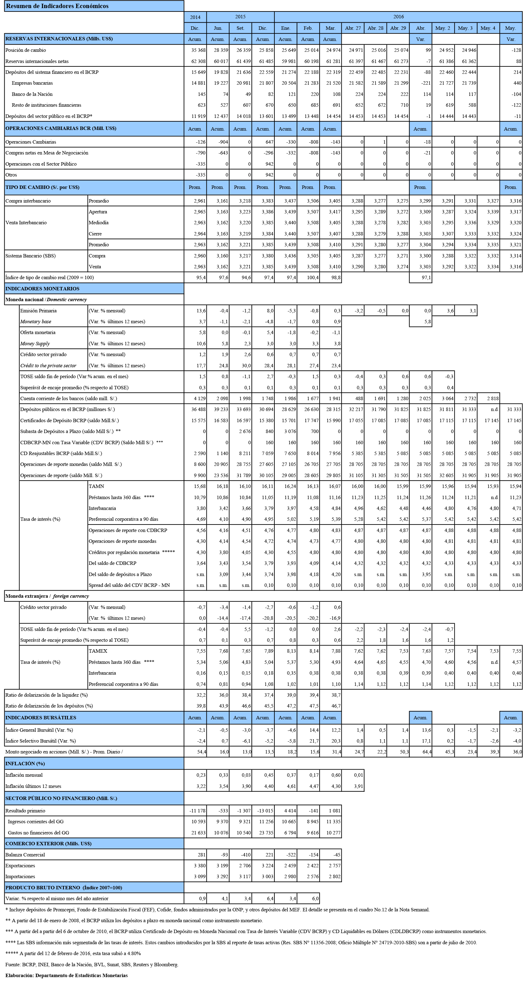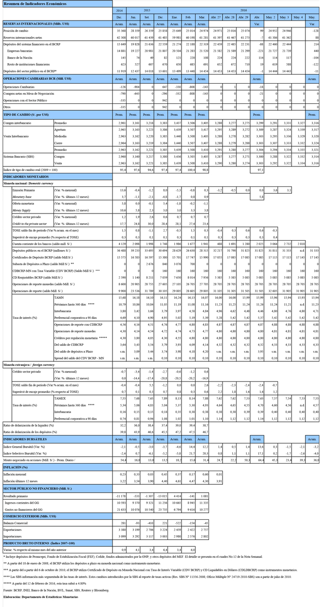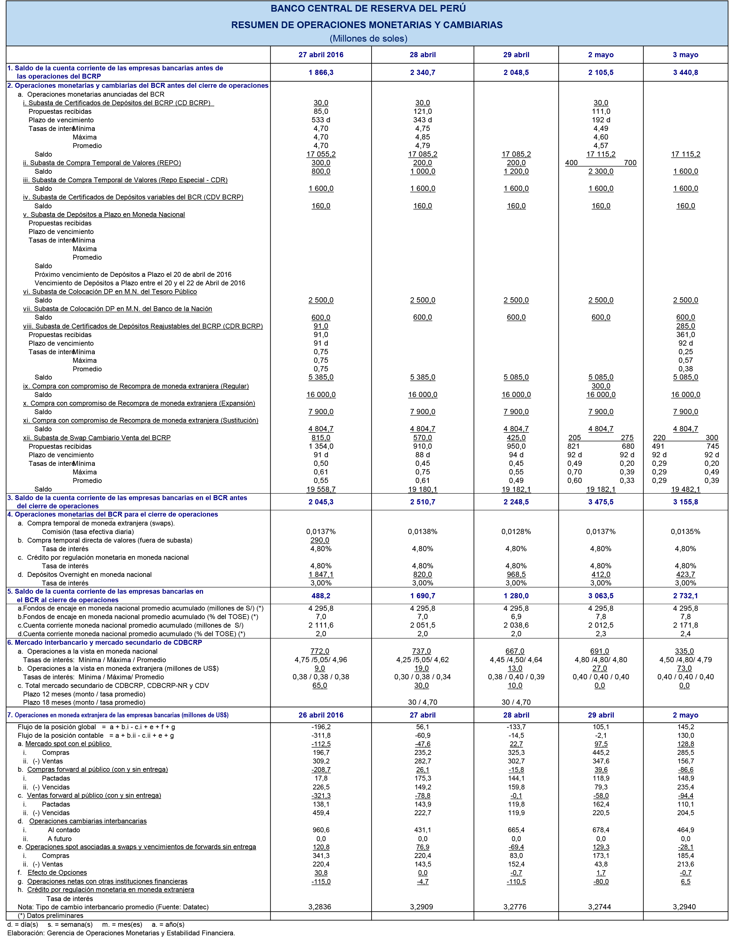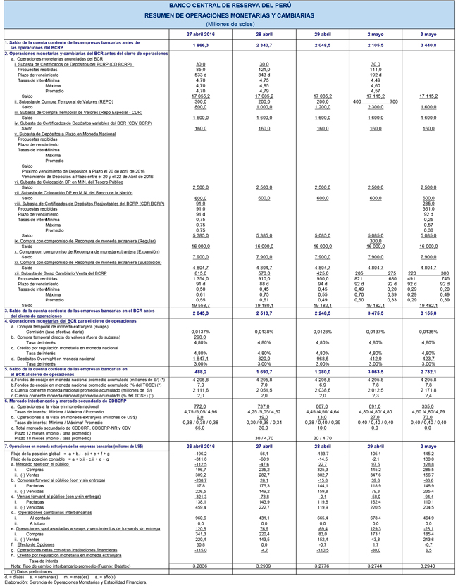 • Depósitos overnight: Al 3 de mayo, el saldo de depósitos overnight fue de S/ 476 millones con una tasa de interés promedio de 3,00 por ciento. Este saldo al cierre de abril fue de S/ 1 144 millones a la misma tasa de interés.