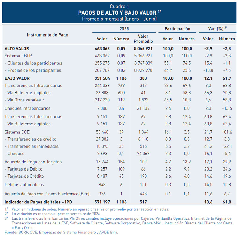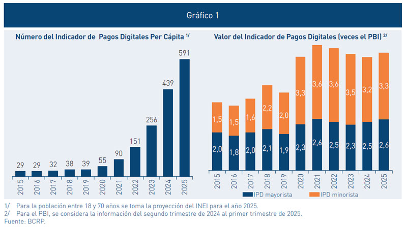 2 El IPD incluye operaciones de clientes de los participantes en el Sistema de Liquidación Bruta en Tiempo Real (LBTR) del BCRP y pagos minoristas digitales (transferencias de crédito e inmediatas vía CCE, transferencias intrabancarias e interbancarias vía billeteras (incluye transferencias interoperables vía billeteras) y otros canales digitales, tarjetas de pago, débito directo y operaciones con dinero electrónico (BIM).