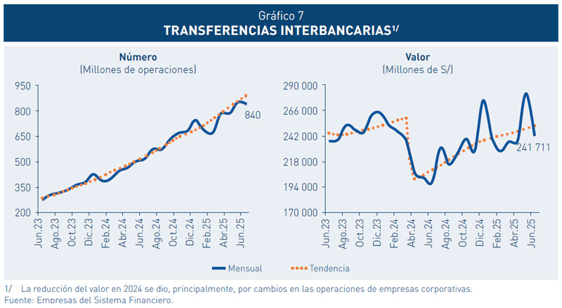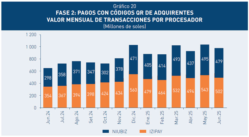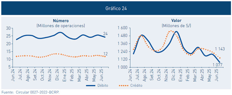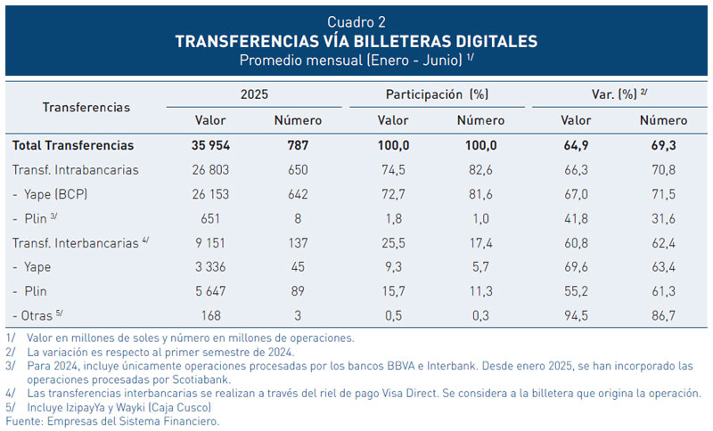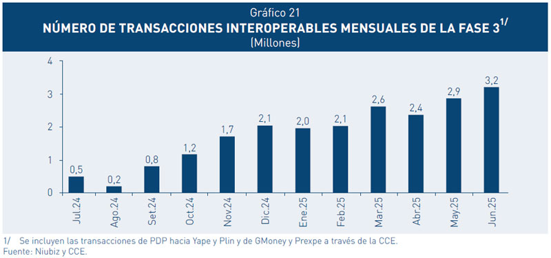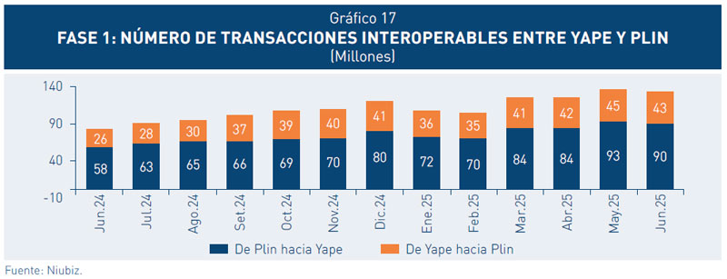 26. El número de transacciones interoperables mensuales correspondientes a la Fase 1 superó los 130 millones al primer semestre de 2025. Los pagos desde la funcionalidad Plin de los bancos BBVA, Interbank y Scotiabank, representan aproximadamente dos tercios de las operaciones; mientras que los pagos desde Yape representan la tercera parte.