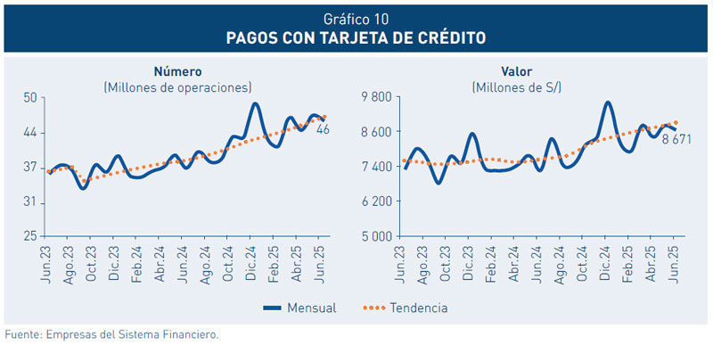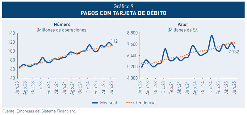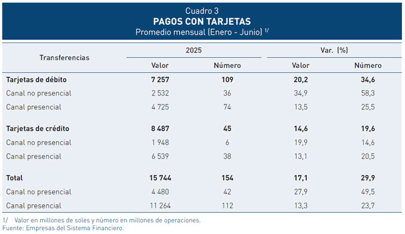 8. El número de compras no presenciales (comercio electrónico) pagadas con tarjetas, principalmente de débito, viene creciendo rápidamente. Así, durante el primer semestre de 2025, las compras no presenciales con tarjetas de débito crecieron 58,3 por ciento en número, con relación a similar periodo del año anterior. Del mismo modo, las compras presenciales con tarjetas de crédito se incrementaron en 20,5 por ciento en número.