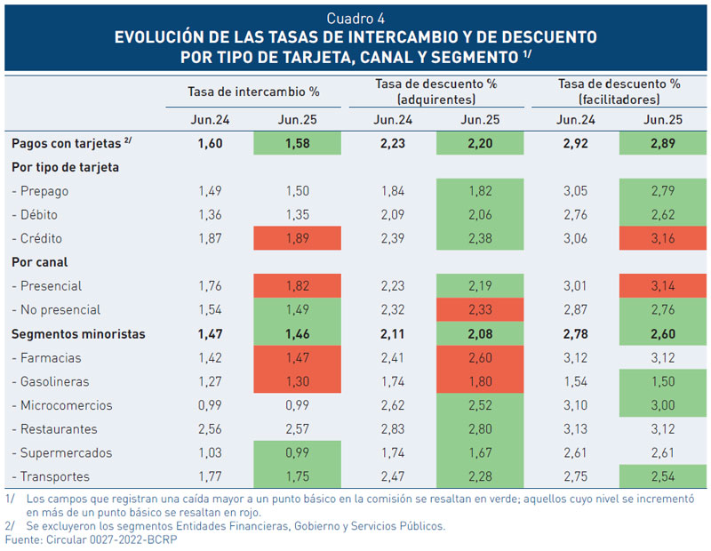 9. El promedio mensual de las comisiones cobradas en el mercado de tarjetas de pago en Perú se redujo ligeramente en los últimos doce meses. A junio de 2025, se registró una reducción interanual de 2 puntos básicos en la tasa de intercambio6 promedio (de 1,60 a 1,58 por ciento). Además, el segmento minorista7 tiene una reducción menor a la observada para el total de tarjetas (de 1,47 a 1,46 por ciento).