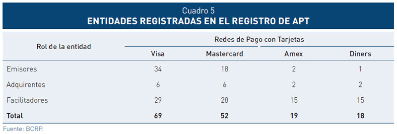 36. El registro de acuerdos de pagos con tarjeta (APT) del BCRP incluye a las entidades participantes en dichos acuerdos, categorizadas bajo los roles de red de pago con tarjetas, emisor, adquirente y facilitador de pagos. Los facilitadores de pago que operan en el Perú son Fintech dedicadas a la provisión de soluciones de procesamiento de pagos con tarjetas a los comercios, a través de la instalación de botones, interfaces de pago en sus páginas web y terminales de puntos de venta.