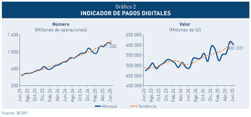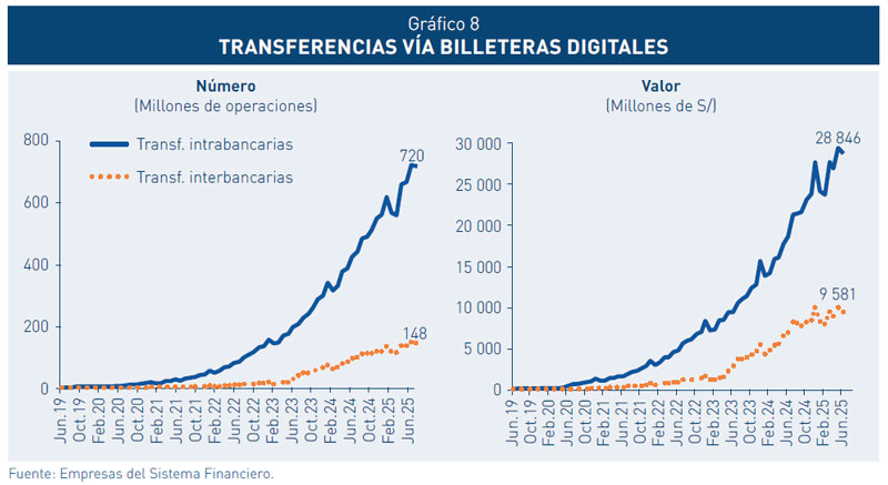 56. En el primer semestre de 2025, los pagos digitales continuaron su rápido crecimiento, impulsados por el mayor uso de billeteras digitales. Además, la supervisión de los sistemas de pagos confirmó el cumplimiento de estándares de seguridad y eficiencia, con una alta calidad en los servicios ofrecidos.