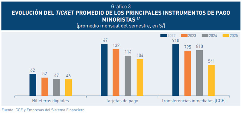 Las transferencias interbancarias vía billeteras digitales superan en monto y número a los pagos con tarjeta de débito y crédito. Sin embargo, los tres instrumentos de pago registran tasas de crecimiento importantes. Además, continúa reduciéndose el ticket promedio de los pagos de bajo valor, profundizando su presencia en transacciones efectuadas usualmente con efectivo (ver Gráfico 3).