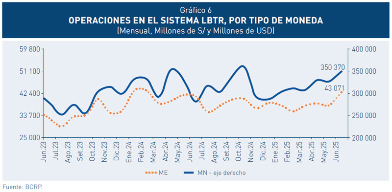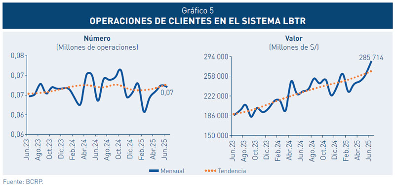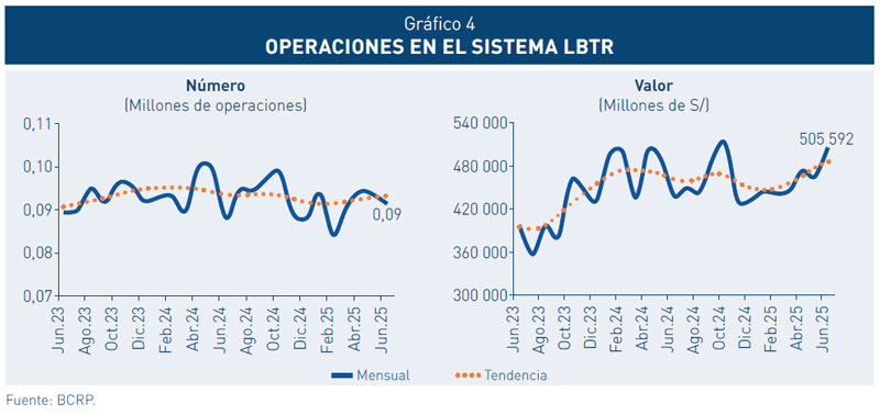 3. En el primer semestre de 2025, el valor de las operaciones en el Sistema LBTR se redujo en 2,9 por ciento en comparación con el mismo periodo del año anterior. Esta disminución se explica, principalmente, por la caída en las operaciones propias de los participantes, cuyo valor se redujo en 18,8 por ciento, relacionado principalmente a la reducción de operaciones en el mercado secundario de CD BCRP y de préstamos en moneda extranjera.