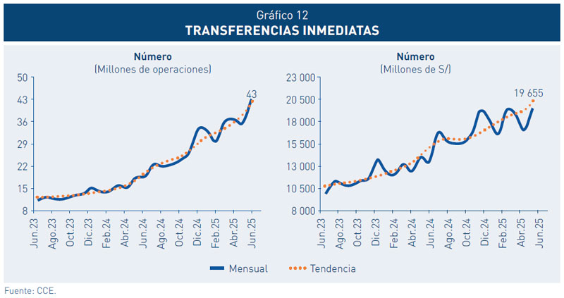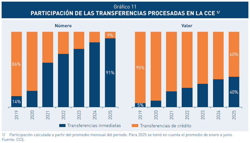 11. Durante el primer semestre de 2025, las transferencias inmediatas aumentaron 41,2 por ciento en valor y 122,1 por ciento en número de operaciones, respecto al mismo periodo del año anterior, impulsadas principalmente por la consolidación de la Fase 2 de la Estrategia de Interoperabilidad.