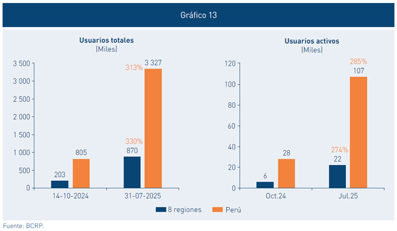 18. La adopción del dinero digital viene incrementándose en lo que va de la marcha del Piloto, en mayor medida, en las 8 regiones de baja bancarización de mayor interés9. El número de usuarios activos de la billetera digital BiPay, es decir, los usuarios que han originado una transacción de transferencia de fondos o pago de servicios con dinero digital en un periodo determinado; ha pasado de 27 869 en octubre de 2024 a 107 226 en el mes de julio de 2025, registrando un crecimiento de 285 por ciento. En las 8 regiones de baja bancarización, los usuarios activos se incrementaron en 274 por ciento en el mismo periodo.