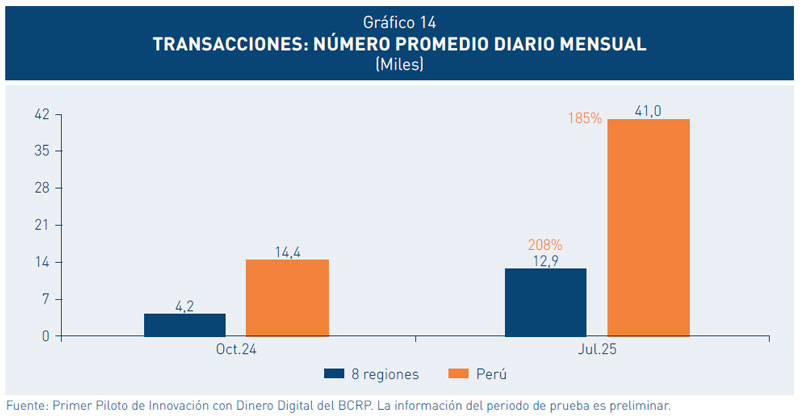19. El número de transacciones crece con mayor rapidez en las 8 regiones de baja bancarización. La transaccionalidad viene creciendo como respuesta del aumento de los usuarios activos. A nivel nacional, en el mes de octubre de 2024 se realizaban 14,4 mil transacciones al día, mientras que en julio de 2025 este número aumentó a 41 mil. En las 8 regiones el crecimiento del número de transacciones promedio diario ha sido mayor pasando de 4,2 mil a 12,9 mil en similar periodo.
