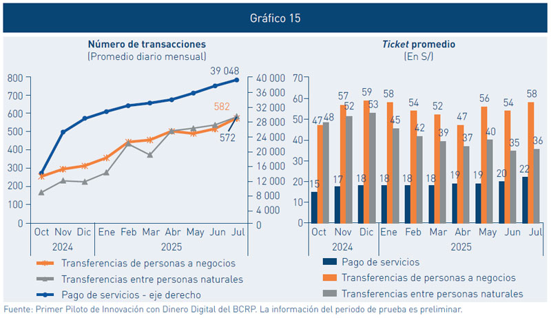 El Piloto de Innovación con Dinero Digital (CBDC) del BCRP inició su fase anual el 10 de marzo de 2025, luego de que se finalizara con éxito su fase de pruebas, registrando, a julio de 2025, a 107 226 usuarios activos y un promedio diario de 41 mil transacciones.
