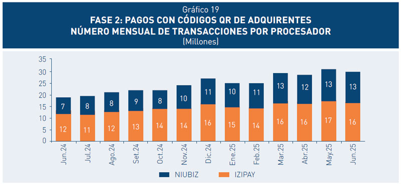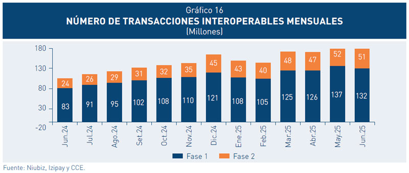 25. La Estrategia de Interoperabilidad del BCRP, desplegada progresivamente por fases, viene incrementando la adopción y uso de los pagos digitales en el país. La Fase 1 (Interoperabilidad entre Yape y Plin) y la Fase 2 (aplicativos bancarios y Códigos QR), que iniciaron en marzo de 2023 y setiembre de 2023, respectivamente, han generado más de 183 millones de transacciones mensuales, a junio de 2025. Esto se debe principalmente a la facilidad de uso de las billeteras, la creciente penetración de los Códigos QR en comercios y el aumento de los pagos a través de aplicativos bancarios.