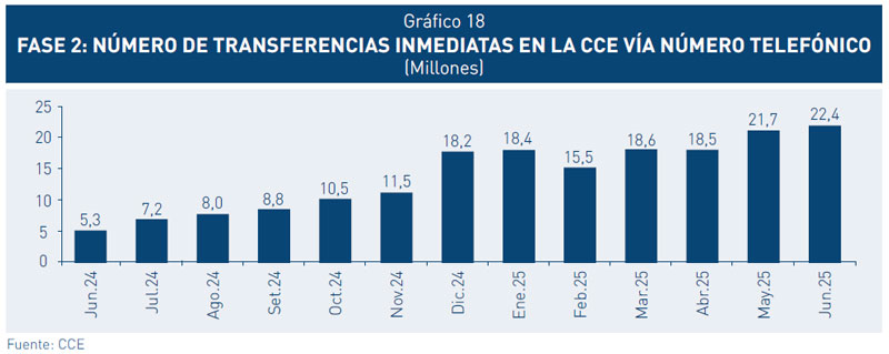 27. La Fase 2 de la estrategia también sigue consolidándose, con un crecimiento sostenido en los últimos meses. Las transferencias inmediatas vía número telefónico a través de la CCE han crecido continuamente desde su implementación. A junio de 2025, se han generado más de 22 millones de transacciones mensuales, lo que representa un significativo aumento si se compara con los 5,3 millones de transacciones registradas en junio de 2024.