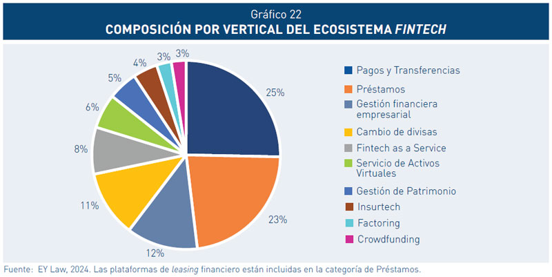 34. De acuerdo con EY Law, a diciembre de 2024 (última información pública disponible) se registraron 237 Fintech en Perú (versus 203 en 2023). Del total de Fintech, el 25 por ciento opera en el segmento de pagos y transferencias, el 23 por ciento en el de préstamos, el 12 por ciento ofrece servicios de gestión financiera empresarial y el 11 por ciento se dedica al cambio de divisas.
