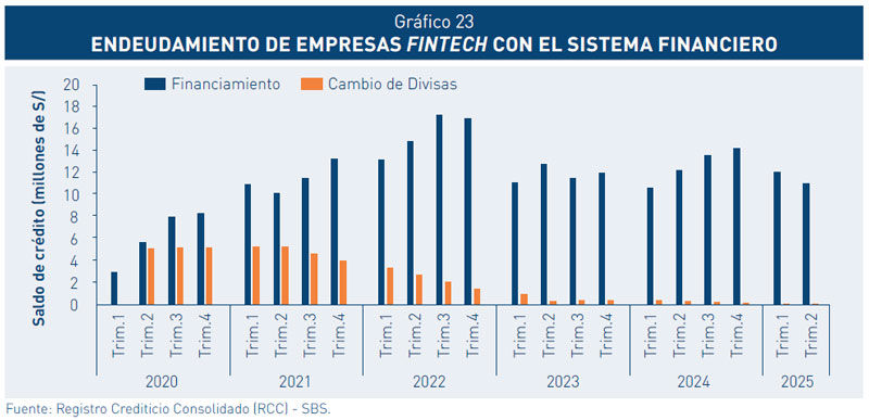 24 Este monto corresponde a 36 empresas Fintech de financiamiento y de cambio de divisas identificadas en el registro crediticio consolidado de la SBS.