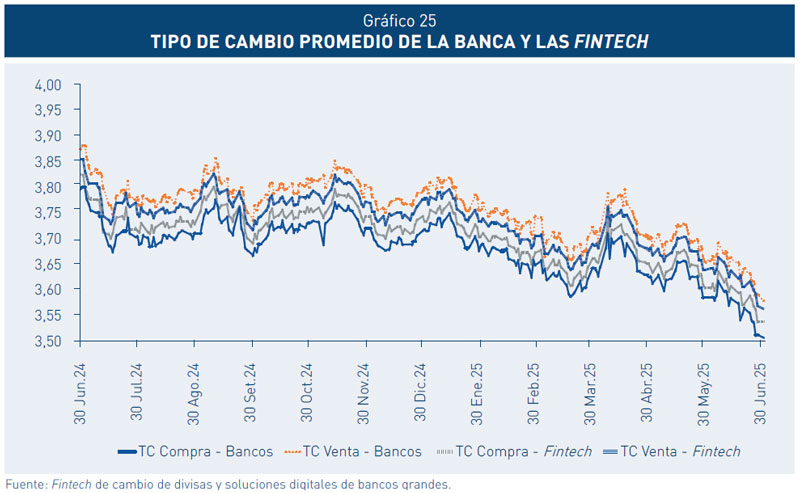A junio de 2025, el spread promedio de los últimos 12 meses Fintech fue de S/ 0,029 versus S/ 0,077 de la banca (en junio de 2024, estos fueron de S/ 0,025 y S/ 0,090, respectivamente). Por su parte, el promedio del spread cambiario, así como su variabilidad, ofrecido por las soluciones bancarias digitales de cambio de divisas en el segmento minorista ha continuado reduciéndose.