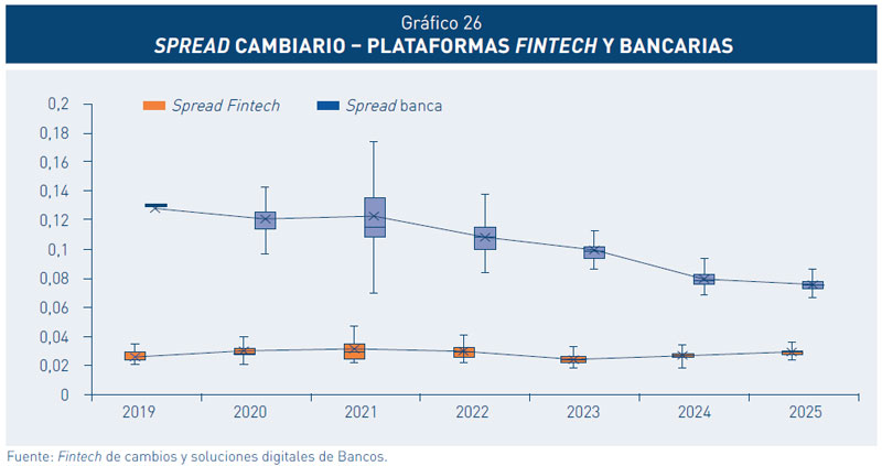 Las Fintech de Cambio de Divisas siguen ofreciendo spreads cambiarios más reducidos que la banca, si bien estas últimas vienen disminuyendo sus spreads producto de la mayor competencia. Las Fintech han introducido innovaciones que simplifican operaciones y reducen costos. Asimismo, para facilitar la toma de decisiones cambiarias, han incorporado herramientas analíticas y alertas en tiempo real que permiten a los usuarios contar con información actualizada y relevante. De igual modo, han optado por reforzar su seguridad digital mediante tecnologías avanzadas para proteger la información del cliente y generar confianza.