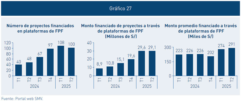41. En el primer semestre de 2025, se han financiado 208 proyectos (2,4 veces el número de proyectos financiados en el mismo semestre de 2024) por un total de S/ 58,7 millones (tres veces el monto financiado en el mismo semestre de 2024). Cabe resaltar que el crecimiento registrado durante el periodo corresponde exclusivamente a una sociedad administradora de plataforma de FPF.