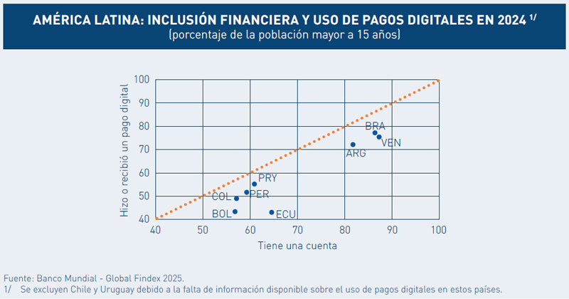 A nivel de Latinoamérica, existe una marcada heterogeneidad. Se observa dos grupos: países con más del 80 por ciento de su población financieramente incluida como Argentina, Brasil y Venezuela; y aquellos con niveles entre 50 y 70 por ciento como Bolivia, Colombia, Ecuador, Paraguay y Perú. Asimismo, existe una relación directamente positiva entre el uso de los pagos digitales y la inclusión financiera, lo que implica que el incremento de transacciones digitales depende en gran medida de la proporción de personas con cuentas bancarias.