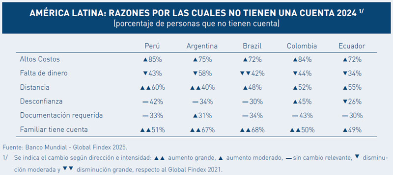 En comparación con otros países, la distancia de las instituciones financieras representa en el Perú una barrera más significativa, evidenciando una persistente percepción de exclusión territorial y una limitada expansión de la red financiera, especialmente en zonas rurales o de difícil acceso (García y Andía, 2022). Por su parte, la razón "familiar tiene cuenta" ha aumentado en toda la región, lo que antepone un patrón regional de uso compartido de productos financieros, lo cual restringe el acceso individual y limita el desarrollo de una inclusión financiera plena.