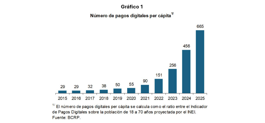 3. Los pagos digitales, medidos a través del Indicador de Pagos Digitales (IPD) , continuaron su rápido crecimiento. En 2025, el número de pagos digitales por adulto alcanzó los 665 al año, equivalente a un promedio de 1,8 pagos digitales por día. Este resultado representa un incremento de 45,8 por ciento respecto a 2024. El crecimiento se explica principalmente por la rápida expansión de los pagos de bajo valor, destacando el mayor uso de billeteras digitales y el dinamismo de los pagos con tarjetas de débito. La transformación del ecosistema de pagos digitales minoristas ha sido impulsada por la implementación de las distintas fases de la estrategia de interoperabilidad del BCRP, que permitió pasar de un ecosistema fragmentado a uno integrado. Asimismo, el BCRP ha facilitado el acceso de nuevos participantes mediante cambios normativos complementarios, promoviendo la innovación y la competencia.