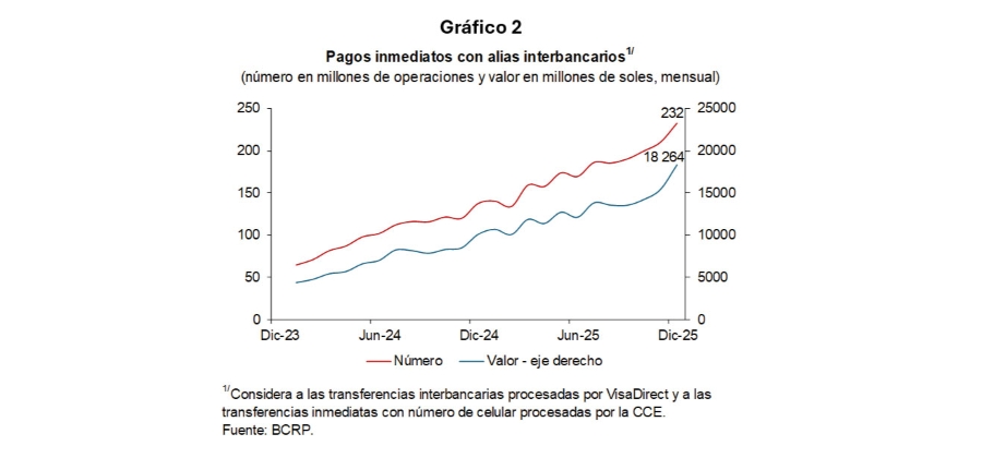 4. Los pagos inmediatos con alias corresponden a las operaciones realizadas a través de billeteras digitales y banca móvil utilizando un identificador alternativo —como el número de celular— para identificar al receptor de los fondos. En 2025, el número de pagos inmediatos con alias aumentó 63,0 por ciento respecto de 2024. Este crecimiento fue impulsado principalmente por los pagos inmediatos con alias interbancarios, que registraron un incremento de 73,8 por ciento, superior al observado en los pagos intrabancarios (60,0 por ciento). En este contexto, la participación de los pagos inmediatos con alias interbancarios en el número total de pagos de bajo valor se incrementó de 12,1 a 14,3 por ciento.