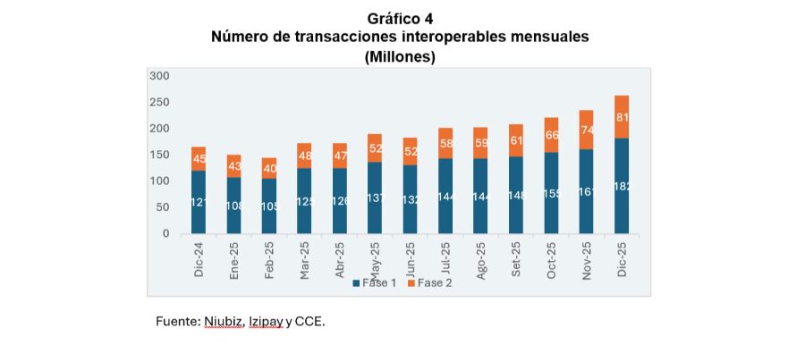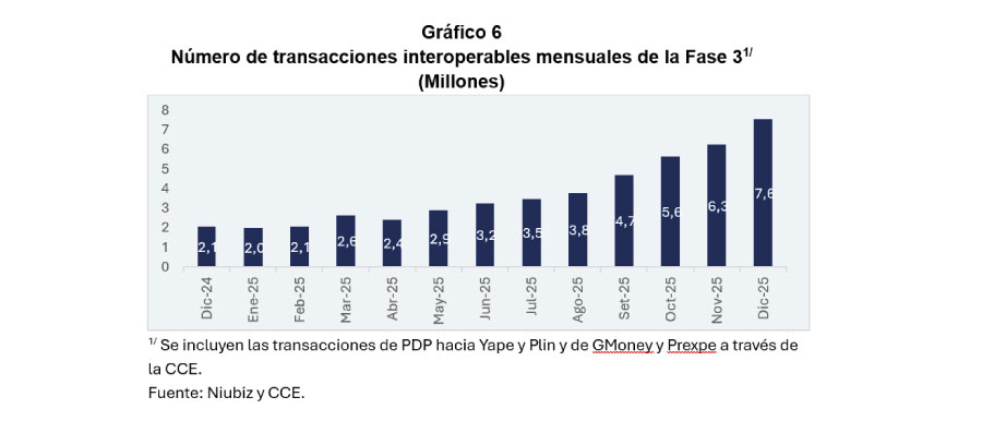 6. La Estrategia de Interoperabilidad del BCRP, desplegada progresivamente por fases desde 2022, viene incrementado la adopción y uso de los pagos digitales en el país. La Fase 1 (Interoperabilidad entre Yape y Plin) y la Fase 2 (aplicativos bancarios y Códigos QR), que iniciaron en marzo de 2023 y setiembre de 2023, respectivamente, han generado más de 263 millones de transacciones mensuales en diciembre de 2025. Esto se debe principalmente a la facilidad de uso de las billeteras, la creciente penetración de los Códigos QR en comercios y el aumento de los pagos a través de aplicativos bancarios.